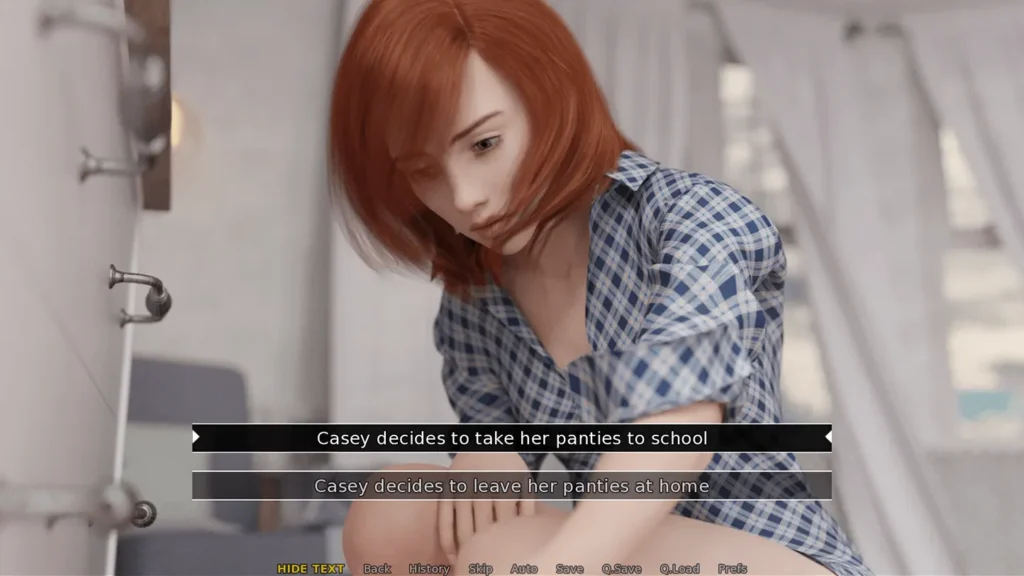Casey’s Fall is a game that isn’t afraid to explore dark and complex psychological themes. It’s a bold exhibitionism theme game that uses the concept not for titillation, but as a tool for narrative exploration and character breakdown. The blackmailer’s demands often force Casey into situations where she must perform for an unseen audience, creating a deep sense of vulnerability and powerlessness.