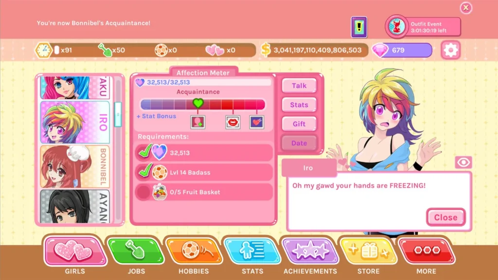 💡 Pro Tip: Don’t neglect your hobbies! A common idle clicker game tips is to prioritize resource generation, but here, affection is the ultimate resource. Always check what a girl likes and invest time in those specific hobbies.